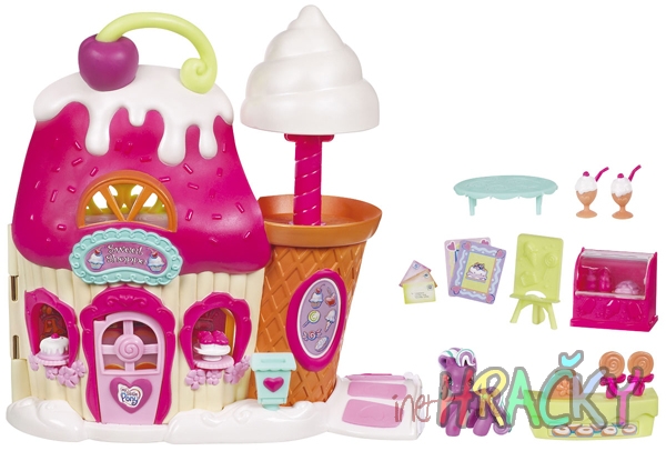 V CUKRÁRNĚ U PONÍKŮ je vždycky plno, protože nabízí ty nejsladší pochoutky ve městě. V prvním patře jsou dortíky a barevné bonbony. V horním patře mohou poníci mlsat pod velkým kornoutem zmrzliny. Když stisknete srdíčko, z okna se vysune tác. O další zábavu se postará otevírací poštovní schránka, otočné tácy ve výloze a mrazák na zmrzlinu. Sada obsahuje figurku poníka SLADĚNKY, pult, stolek, stojan, mrazák, 2 lízátka, 2 kornouty zmrzliny, 2 mléčné koktejly, 2 zákusky, jídelní lístek a dopisy.
