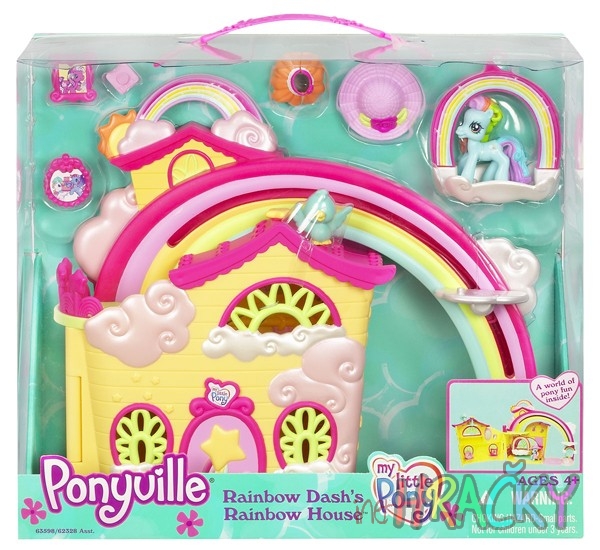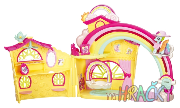 V tomto kouzelném pestrobarevném domku, kde bydlí DUHOVKA, je vždycky čas na oslavu! Vyjeďte s DUHOVKOU po duze nahoru a vstupte dovnitř. Ve dvou patrech najdete funkční houpací síť ve tvaru obláčku, ptáčka, který se může usadit na střeše, a knoflík ve tvaru hvězdy – když jím otočíte, zapnete větrání v pokoji. Až si dohrajete, zabalte všechno dovnitř a můžete si domek vzít s sebou a hrát si s poníky kdykoli a kdekoli. Sada obsahuje figurku poníka DUHOVKA, sukni, klobouk, fotoaparát, ptáčka a 2 rámečky na fotky.