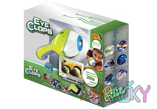 Eye Clops - 200x zvětšuje jako mikroskop, nebo zvětšovací sklo. Obrázky zvětšovaných předmětů promítá na televizi.Eye Clops je bionické oko, které můžeš propojit s TV, a podívat se na věci očima 200násobného zvětšení. Vlákna koberce se rázem promění v lodní lana, krystalky soli ti budou připadat jako ledové kry a hologramy na tvé obrazovce rozehrají krásně barevnou světelnou show. A co dalšího se skrývá ve věcech, které tě obklopují?