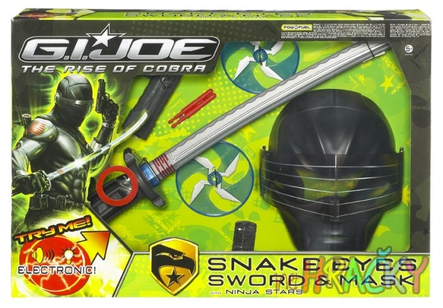 Filmová sada snake je úžasná pro každého malého válečníka. S touto skvělou sadou si můžete opravdu vychutnat tu pravou akci! Nasaďte si masku postavy SNAKE EYES a vyzkoušejte si, jaké je to být hrdinou z týmu G. I. JOE. Pak popadněte meč a hvězdice a můžete se utkat s nepřáteli. Po stisknutí tlačítka meč vydává světelné a zvukové efekty. Při šermování se ozývají elektronické zvuky meče a dokonce je tu skrytý raketomet, který umožňuje vypálit dvě nálože a překvapit tak nečekaným útokem. Obsahuje meč, masku, pochvu, 2 hvězdice, 2 nálože, vojenskou identifikační známku, návod a 3 baterie typu AAA POWERFUEL. Pro děti od 5 let.