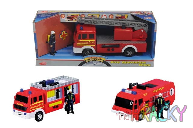 Hasičské auto na setrvačník. Světelné a zvukové efekty. Stříkačka na vodu (mechanická funkce). Délka auta: 16 cm, doporučený věk: 3+