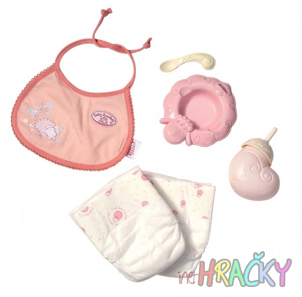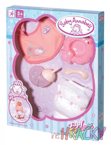 Sada pro péči o Baby Annabell obsahuje vše, co panenka potřebuje pro dobré jídlo: bryndáček, misku, lžičku, lahvičku a 2 plenky pro případ malé nehody.