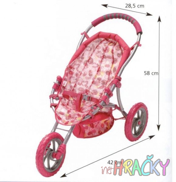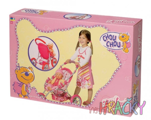 Tříkolový kočárek pro CHOU CHOU s rozměry kočárku: výška od země k rukojeti (58 cm), délka (42 cm), šířka 28,5 cm. Tříkolový kočárek pro CHOU CHOU v novém designu, s nákupním košíkem a upínacími pásy pro panenku.